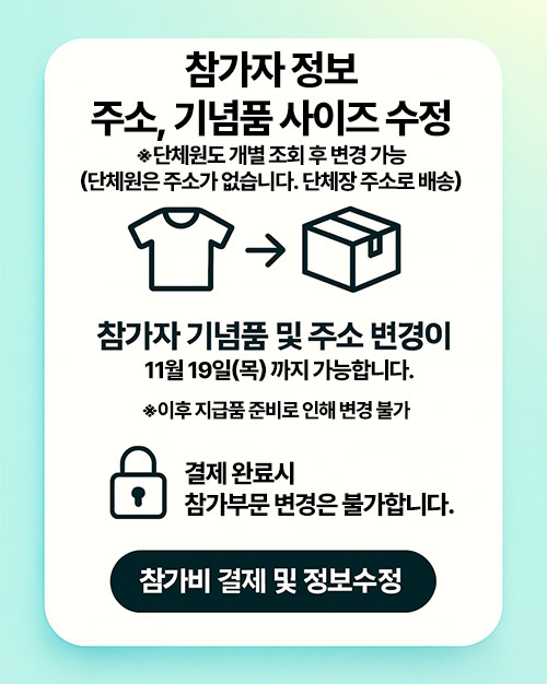 Âü°¡ÀÚ ±â³äǰÀº ´ëȸ 1ÁÖÀÏ ÀÌÀü¿¡ ±â³äǰ, ¹è¹øÈ£¿Í ÇÔ²² ÅÃ¹è ¹ß¼Û µË´Ï´Ù.